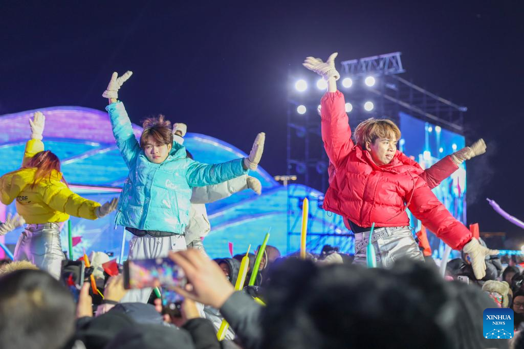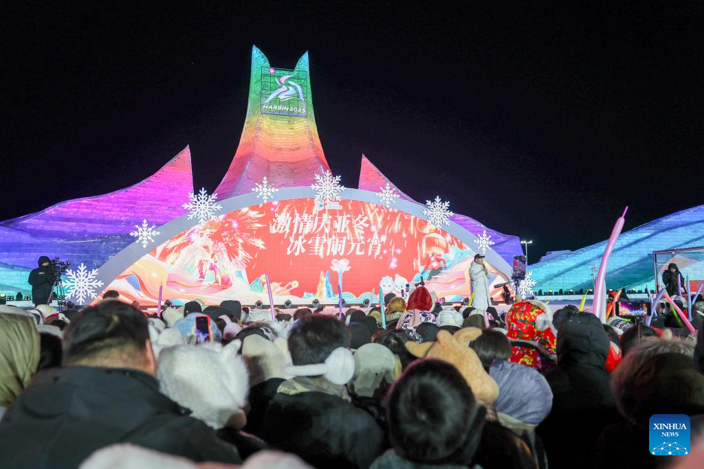 People attend a celebration for the Lantern Festival at the ice and snow world in Harbin, northeast China's Heilongjiang Province, Feb. 12, 2025. (Xinhua/Huang Wei)