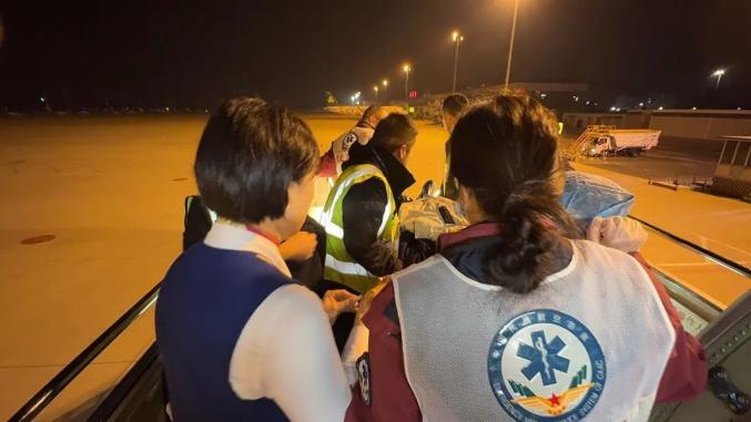 Medical workers swiftly transport the passenger to the hospital on a stretcher. (Photo/Official WeChat account of People's Daily)