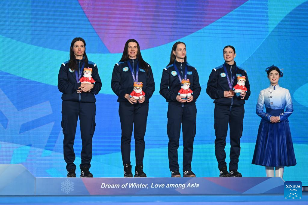 Ko Eunjung, Ekaterina Avvakumova, Mariya Abe and Jung Jumi (L to R) of South Korea pose for photo at the victory ceremony for Biathlon women's 4x6km relay at the 9th Asian Winter Games in Harbin, northeast China's Heilongjiang Province, Feb. 13, 2025. (Xinhua/Lian Zhen)