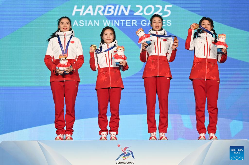 Tang Jialin, Wen Ying, Chu Yuanmeng and Meng Fanqi (L to R) of China pose for photo at the victory ceremony for Biathlon women's 4x6km relay at the 9th Asian Winter Games in Harbin, northeast China's Heilongjiang Province, Feb. 13, 2025. (Xinhua/Lian Zhen)