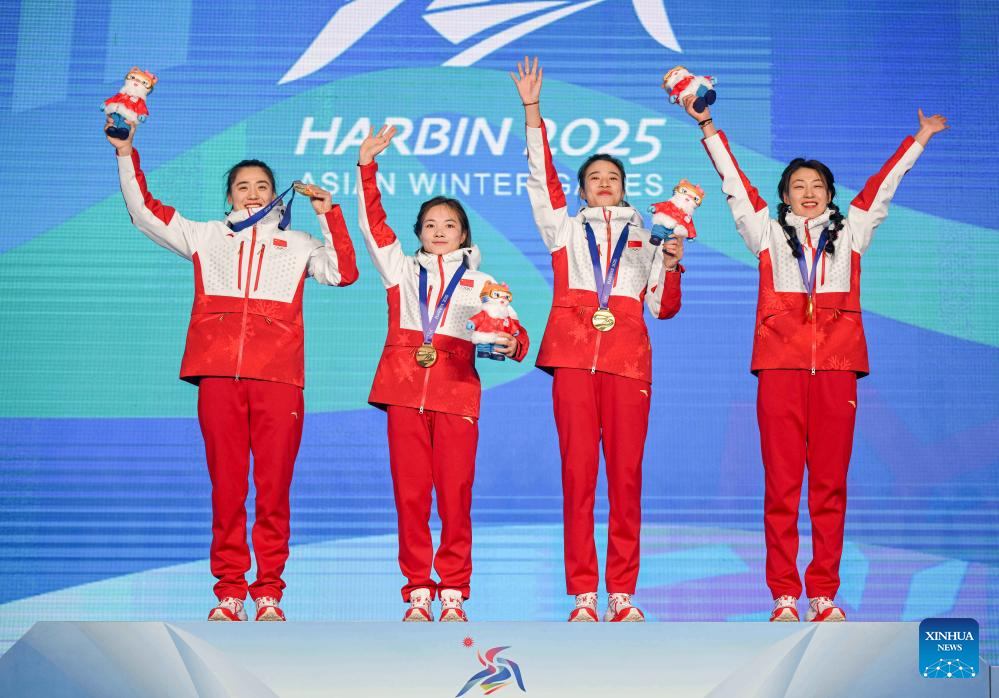 Tang Jialin, Wen Ying, Chu Yuanmeng and Meng Fanqi (L to R) of China celebrate at the victory ceremony for Biathlon women's 4x6km relay at the 9th Asian Winter Games in Harbin, northeast China's Heilongjiang Province, Feb. 13, 2025. (Xinhua/Lian Zhen)