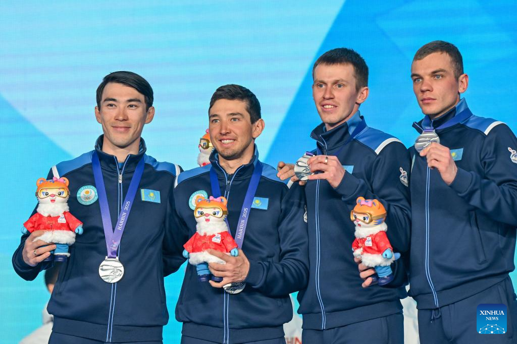 Silver medalists Asset Dyussenov, Alexandr Mukhin, Kirill Bauer and Vladislav Kireyev (L to R) of Kazakhstan pose for a photo at the awarding ceremony for the biathlon men's 4x7.5km relay match at the 9th Asian Winter Games in Harbin, northeast China's Heilongjiang Province, Feb. 13, 2025. (Xinhua/Lian Zhen)