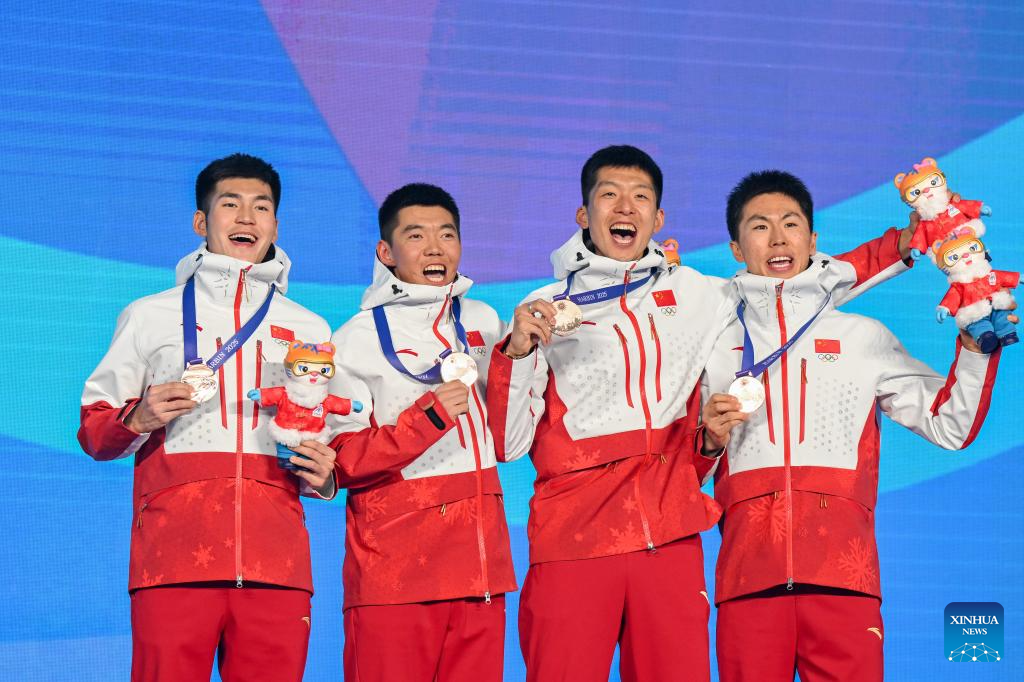 Bronze medalists Hu Weiyao, Wu Hantu, Yan Xingyuan and Gu Cang (L to R) of China react at the awarding ceremony for the biathlon men's 4x7.5km relay match at the 9th Asian Winter Games in Harbin, northeast China's Heilongjiang Province, Feb. 13, 2025. (Xinhua/Lian Zhen)