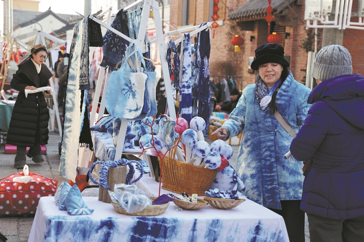 A customer visits a stall selling indigo dyeing products at Xinzhuang Market (Wang Jing/China Daily)