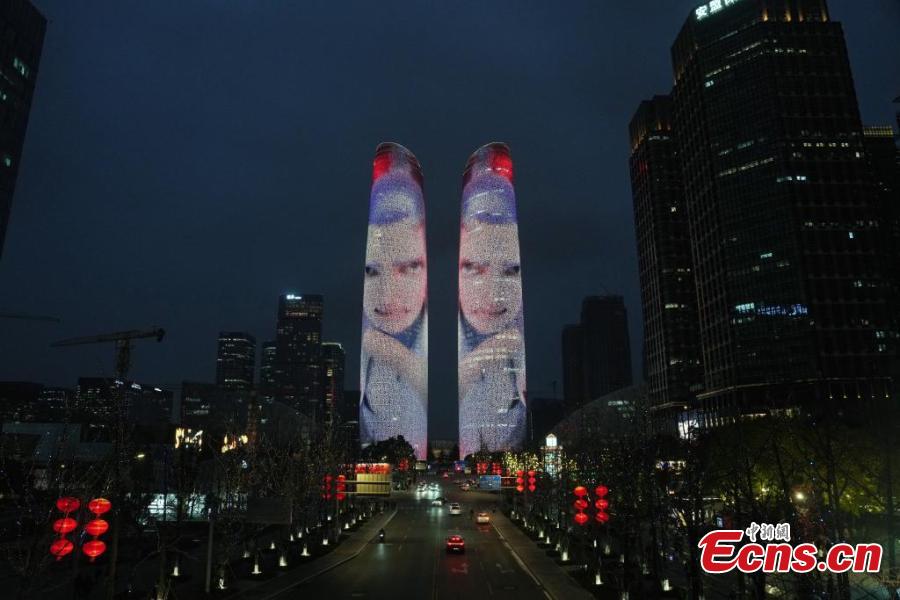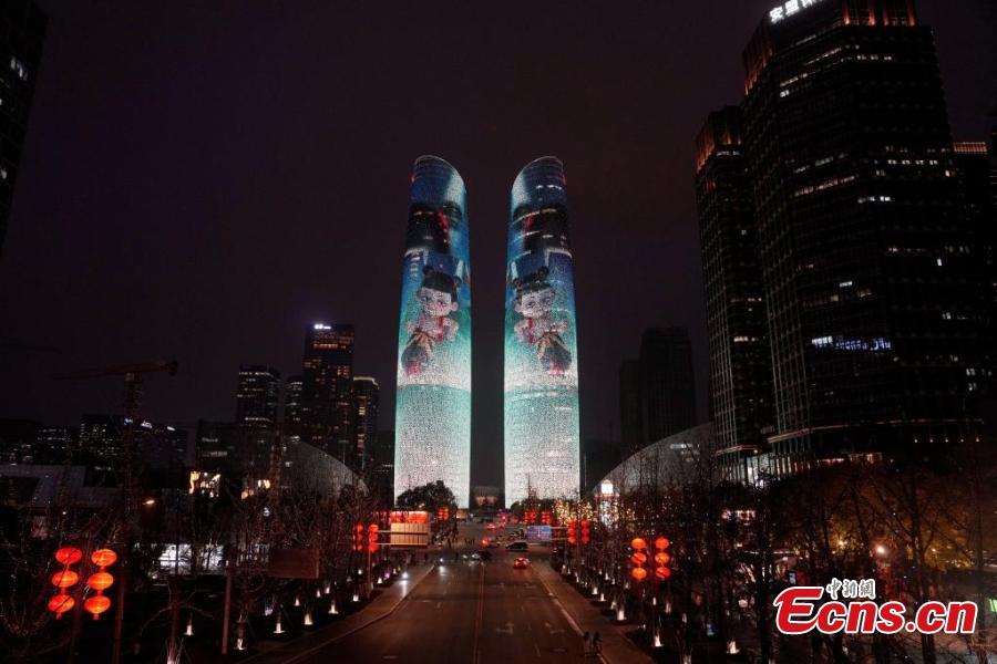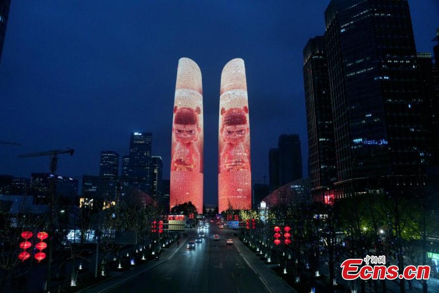 Landmark buildings, the Tianfu Twin Towers, light up with the main characters of China's animated blockbuster "Ne Zha 2" in Chengdu, southwest China's Sichuan Province, Feb. 13, 2025. (China News Service/An Yuan)