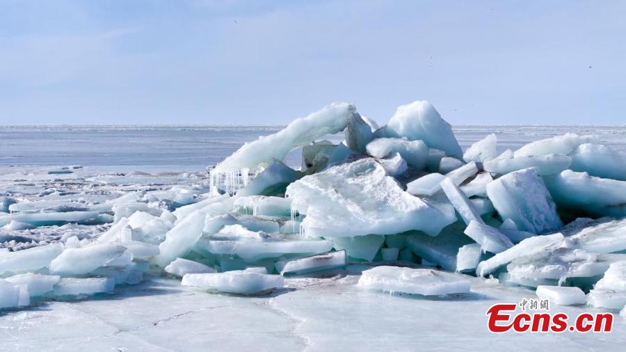 Chunks of blue ice pile up on Qinghai Lake, China's largest inland saltwater lake in Hainan Tibetan Autonomous Prefecture, northwest China's Qinghai Province, Feb. 13, 2025. (China News Service/Xue Di)