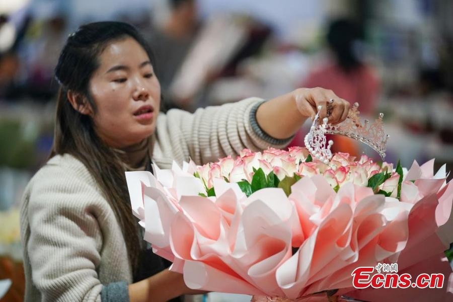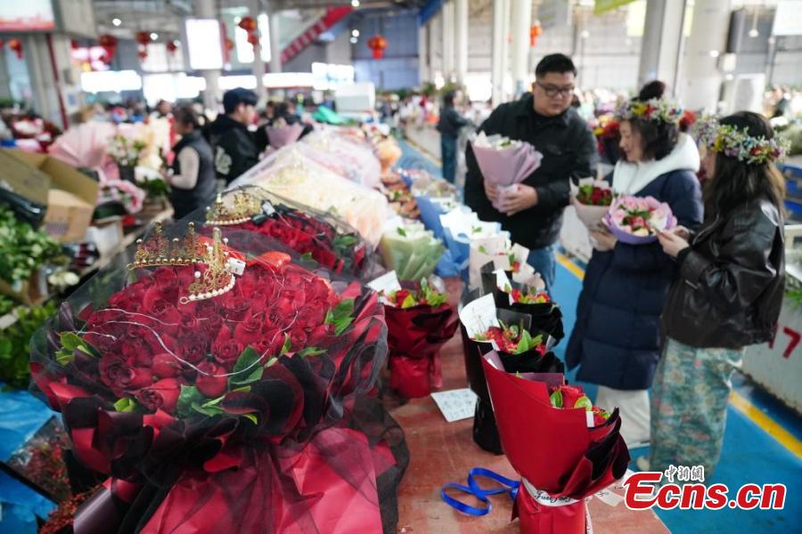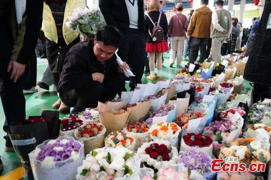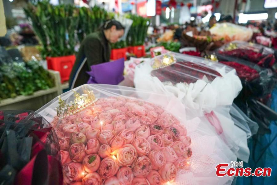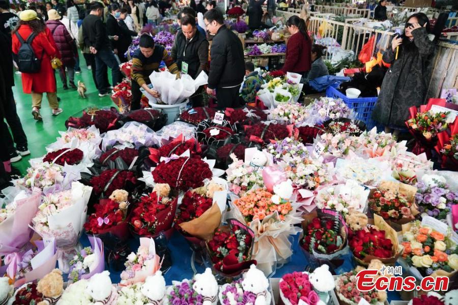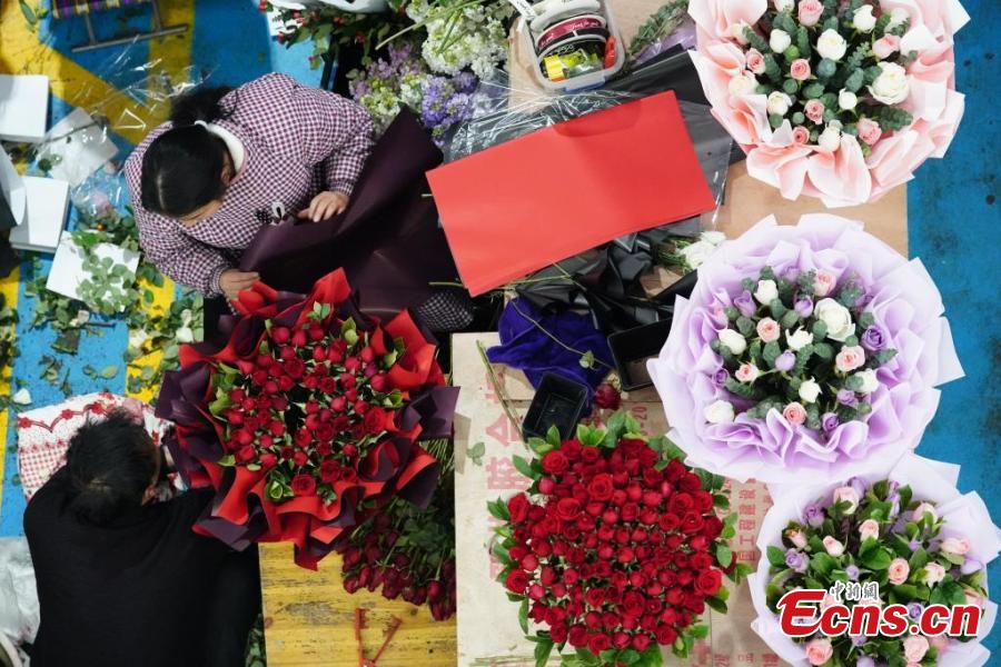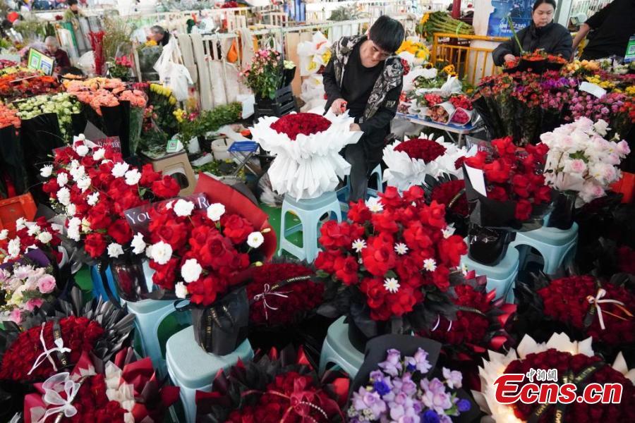 Owners are busy selling and packaging roses in the Dounan Flower Market, Kunming southwest China's Yunnan Province, Feb. 13, 2025. (China News Service/Liu Ranyang)