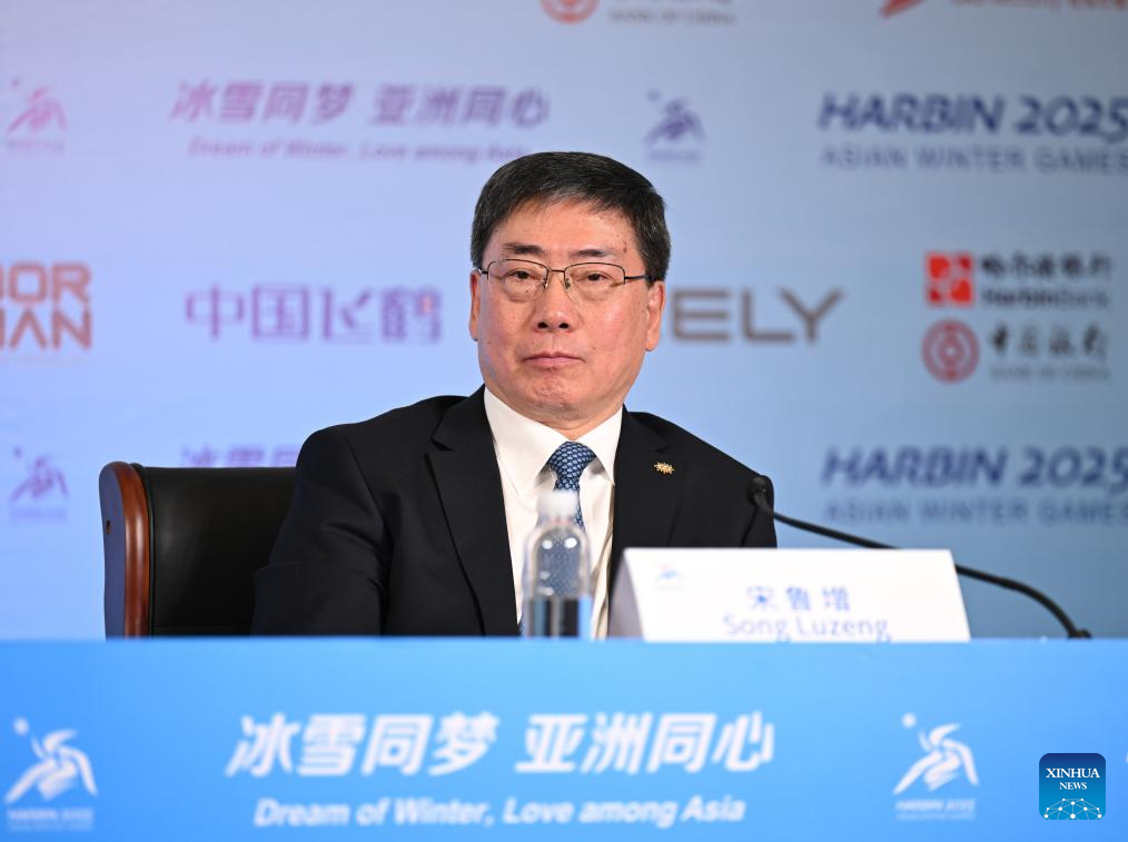 Song Luzeng, vice president of Olympic Council of Asia (OCA), speaks during a press conference held by the OCA and the Harbin Asian Winter Games Organizing Committee (HAWGOC) at the 9th Asian Winter Games in Harbin, northeast China's Heilongjiang Province, Feb. 14, 2025. (Xinhua/Cai Xiangxin)