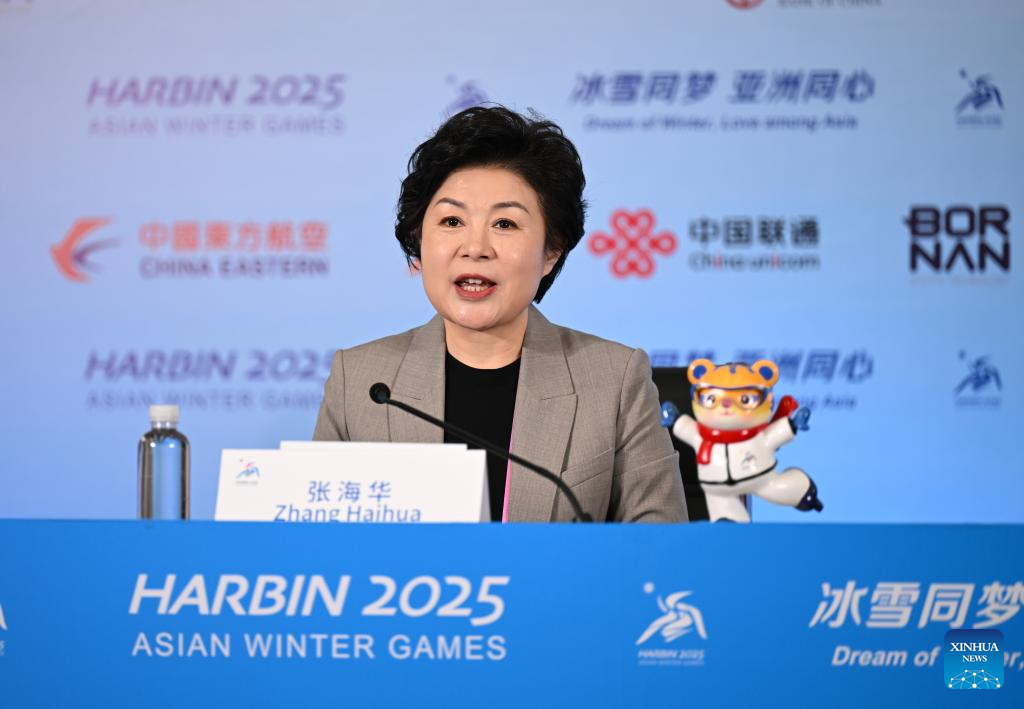 Zhang Haihua, deputy secretary-general and chief spokesperson of the Harbin Asian Winter Games Organizing Committee (HAWGOC) and vice mayor of Harbin, speaks during a press conference held by the Olympic Council of Asia (OCA) and the HAWGOC at the 9th Asian Winter Games in Harbin, northeast China's Heilongjiang Province, Feb. 14, 2025. (Xinhua/Cai Xiangxin)