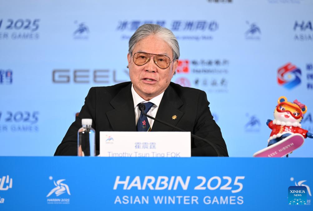Timothy Fok Tsun-ting, vice president of the Olympic Council of Asia, speaks during a press conference held by the OCA and the Harbin Asian Winter Games Organizing Committee (HAWGOC) at the 9th Asian Winter Games in Harbin, northeast China's Heilongjiang Province, Feb. 14, 2025. (Xinhua/Cai Xiangxin)
