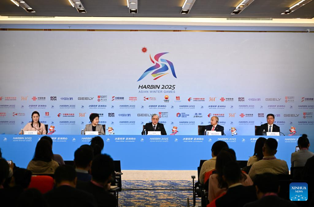 This photo taken on Feb. 14, 2025 shows a press conference held by the Olympic Council of Asia (OCA) and the Harbin Asian Winter Games Organizing Committee (HAWGOC) at the 9th Asian Winter Games in Harbin, northeast China's Heilongjiang Province. (Xinhua/Cai Xiangxin)