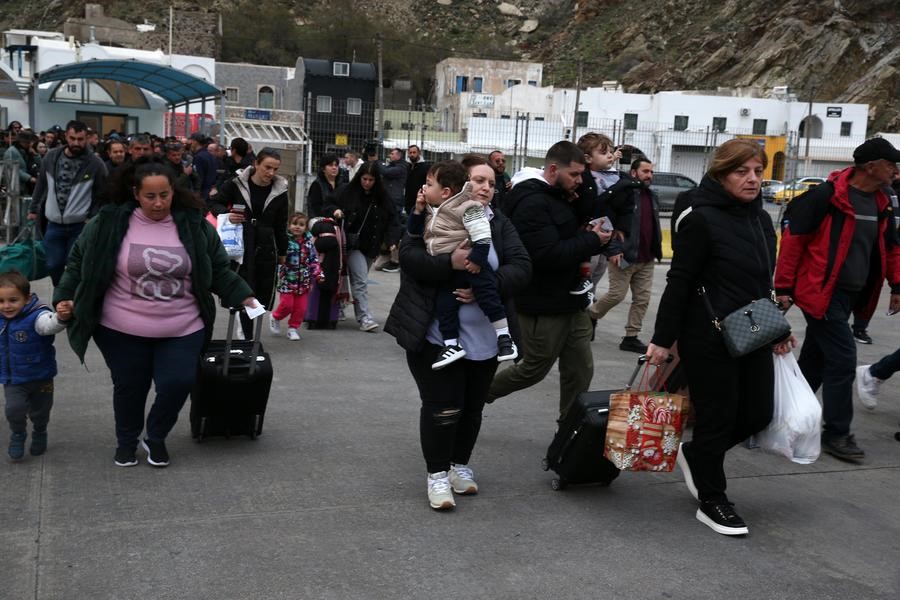 People walk to board a ferry to leave Santorini after earthquakes shook the island, in Santorini, Greece, on Feb. 4, 2025. (Xinhua/Marios Lolos)