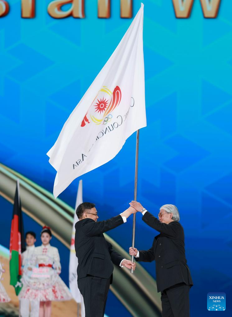 The Olympic Council of Asia (OCA) flag handover ceremony is seen during the closing ceremony of the 9th Asian Winter Games in Harbin, northeast China's Heilongjiang Province, Feb. 14, 2025. (Xinhua/Chen Yichen)