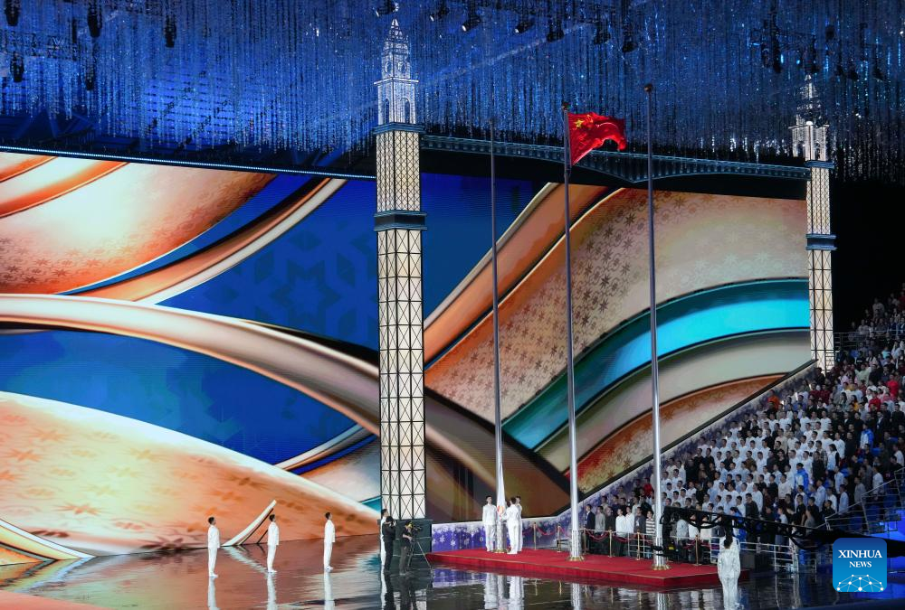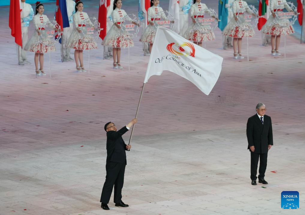 Following a performance that highlighted how sports promote unity, flagbearers and athletes stepped into the "Lilac Ruyi Pattern" displayed on the ground, encircled by the mascots "Bin Bin" and "Ni Ni," symbolizing the unity of Asian countries and regions and embodying the profound essence of "Togetherness" through their close-knit formation.