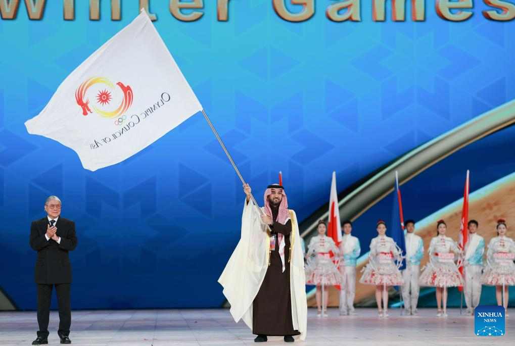 The Olympic Council of Asia (OCA) flag handover ceremony is seen during the closing ceremony of the 9th Asian Winter Games in Harbin, northeast China's Heilongjiang Province, Feb. 14, 2025. (Xinhua/Zhang Tao)