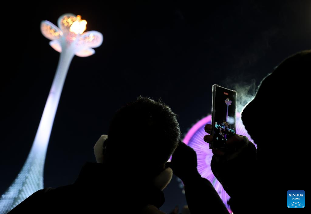 A tourist records the extinguishing of the cauldron at Harbin Ice and Snow World Park during the closing ceremony of the 9th Asian Winter Games in Harbin, northeast China's Heilongjiang Province, Feb. 14, 2025. (Xinhua/Huang Wei)