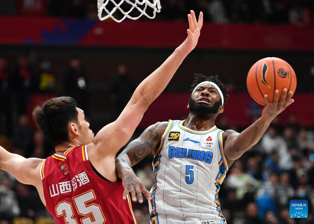 Eugene German (R) of Beijing Ducks goes for a layup during a match between Beijing Ducks and Shanxi Loongs at the Chinese Basketball Association (CBA) Club Cup in Xi'an, northwest China's Shaanxi Province, Jan. 14, 2025. (Xinhua/Zhang Bowen)