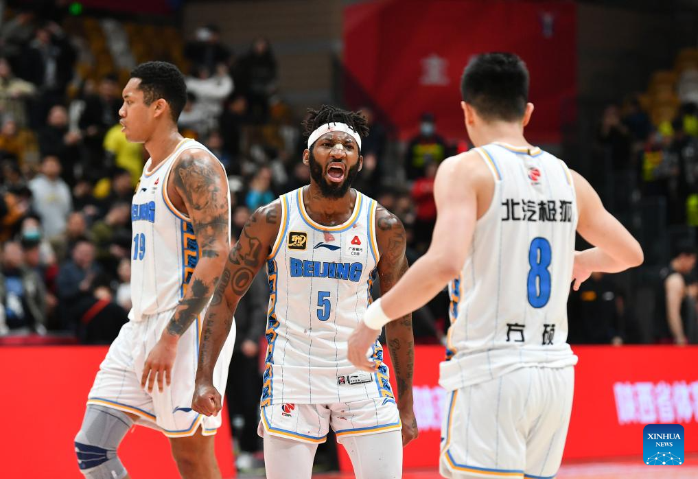 Eugene German (C) of Beijing Ducks celebrates with teammates after a match between Beijing Ducks and Shanxi Loongs at the Chinese Basketball Association (CBA) Club Cup in Xi'an, northwest China's Shaanxi Province, Jan. 14, 2025. (Xinhua/Zhang Bowen)