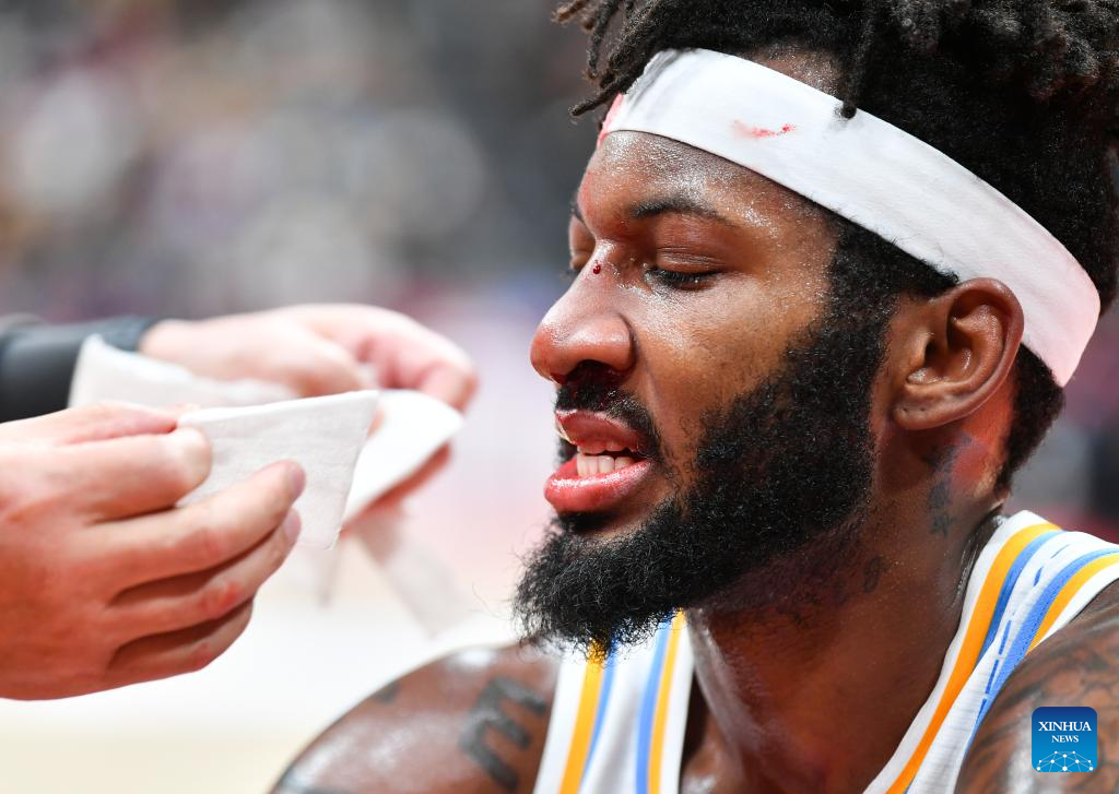Eugene German of Beijing Ducks gets injured during a match between Beijing Ducks and Shanxi Loongs at the Chinese Basketball Association (CBA) Club Cup in Xi'an, northwest China's Shaanxi Province, Jan. 14, 2025. (Xinhua/Zhang Bowen)
