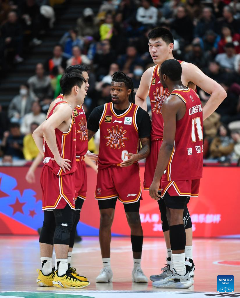 Players of Shanxi Loongs communicate during a match between Beijing Ducks and Shanxi Loongs at the Chinese Basketball Association (CBA) Club Cup in Xi'an, northwest China's Shaanxi Province, Jan. 14, 2025. (Xinhua/Zhang Bowen)