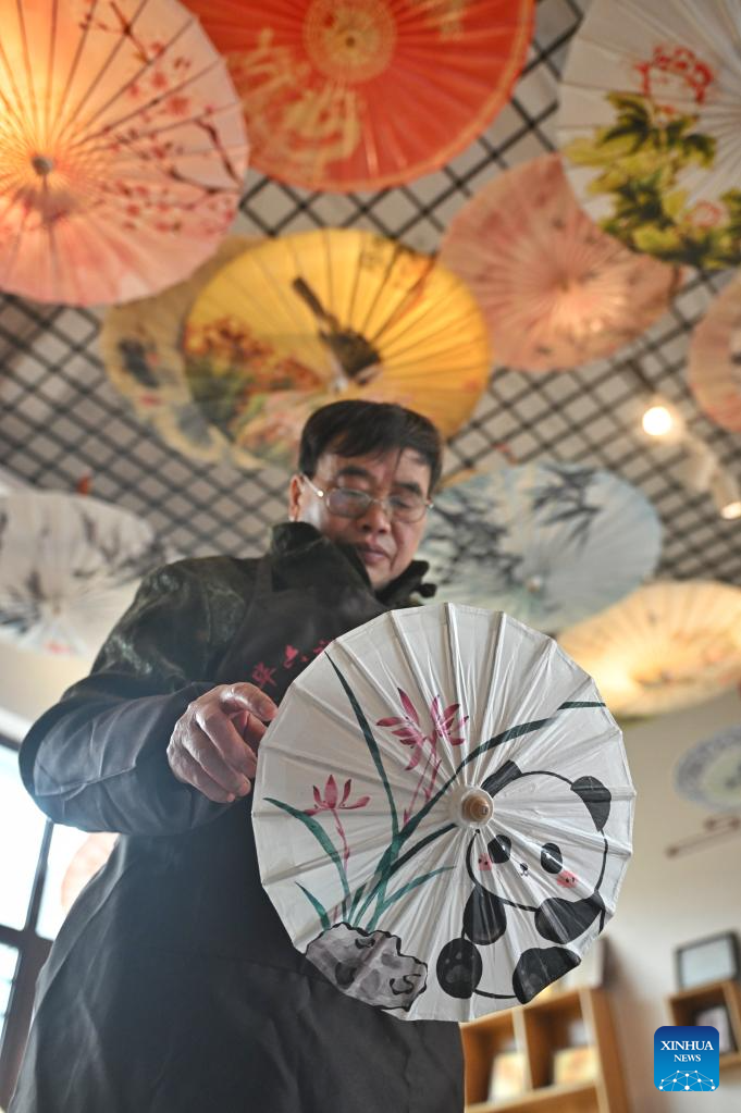 Bi Liufu arranges finished oil-paper umbrellas in Fenshuiling Town of Luzhou City, southwest China's Sichuan Province, Feb. 11, 2025. The making of the Fenshui oil-paper umbrella, which originated in Fenshuiling Town of Luzhou City, is a national-level intangible cultural heritage that boasts a history of over 400 years.