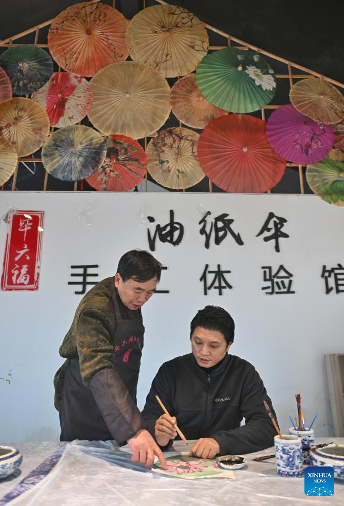Bi Liufu draws a pattern of oil-paper umbrella in Fenshuiling Town of Luzhou City, southwest China's Sichuan Province, Feb. 11, 2025. (Xinhua/Liu Kun)