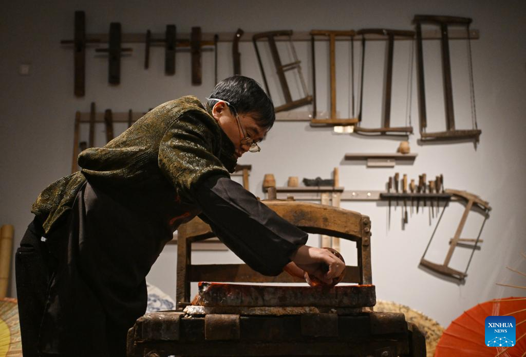 A craftswoman fabricates the frame of an oil-paper umbrella in Fenshuiling Town of Luzhou City, southwest China's Sichuan Province, Feb. 11, 2025. (Xinhua/Liu Kun)