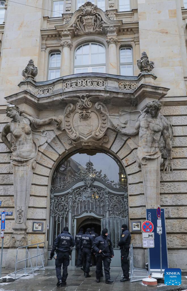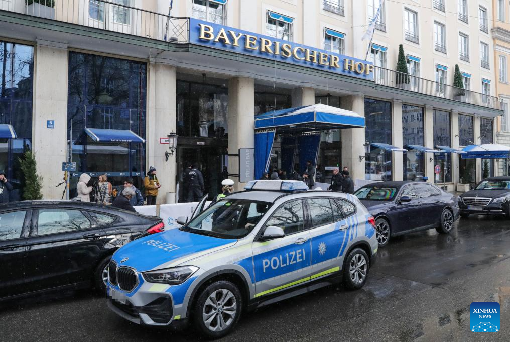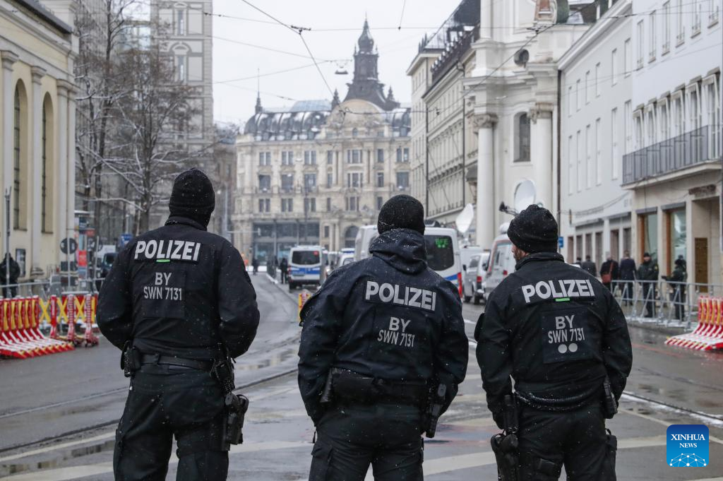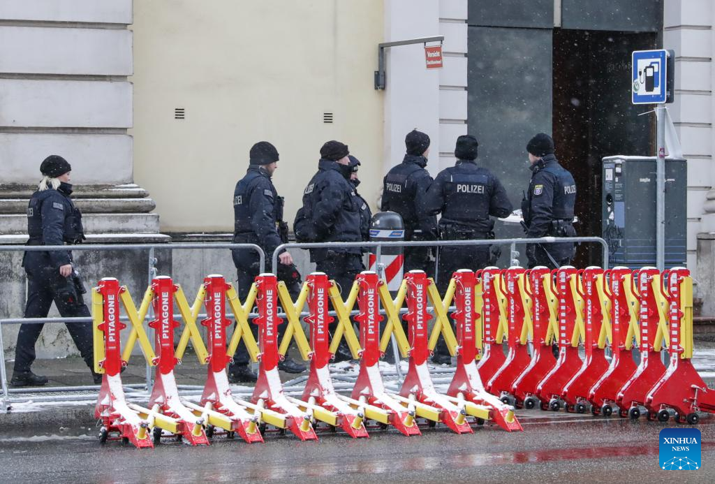 Policemen stand guard near the hotel holding the 61st Munich Security Conference in Munich, Germany, Feb. 16, 2025. The three-day Munich Security Conference concluded here on Sunday. (Xinhua/Zhang Fan)