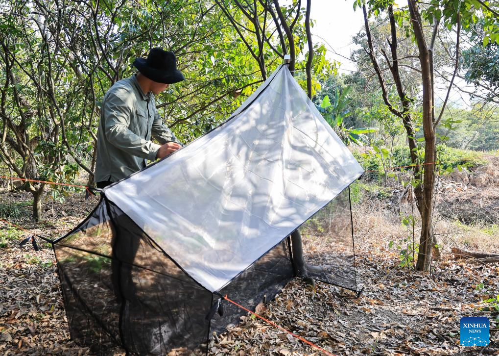 A researcher sets up an installation to collect insect samples at the Haizhu Wetland in Guangzhou, south China's Guangdong Province, Feb. 11, 2025. Chinese researchers have discovered a new insect species, Eidoreus haizhuensis, in a wetland in Guangzhou, the capital city of south China's Guangdong Province, the Guangdong Academy of Sciences said on Sunday. (Xinhua)