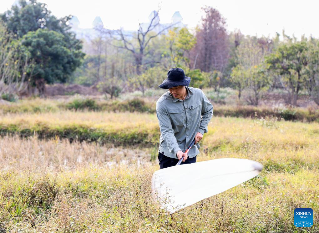 A researcher collects samples at the Haizhu Wetland in Guangzhou, south China's Guangdong Province, Feb. 11, 2025. Chinese researchers have discovered a new insect species, Eidoreus haizhuensis, in a wetland in Guangzhou, the capital city of south China's Guangdong Province, the Guangdong Academy of Sciences said on Sunday. (Xinhua)
