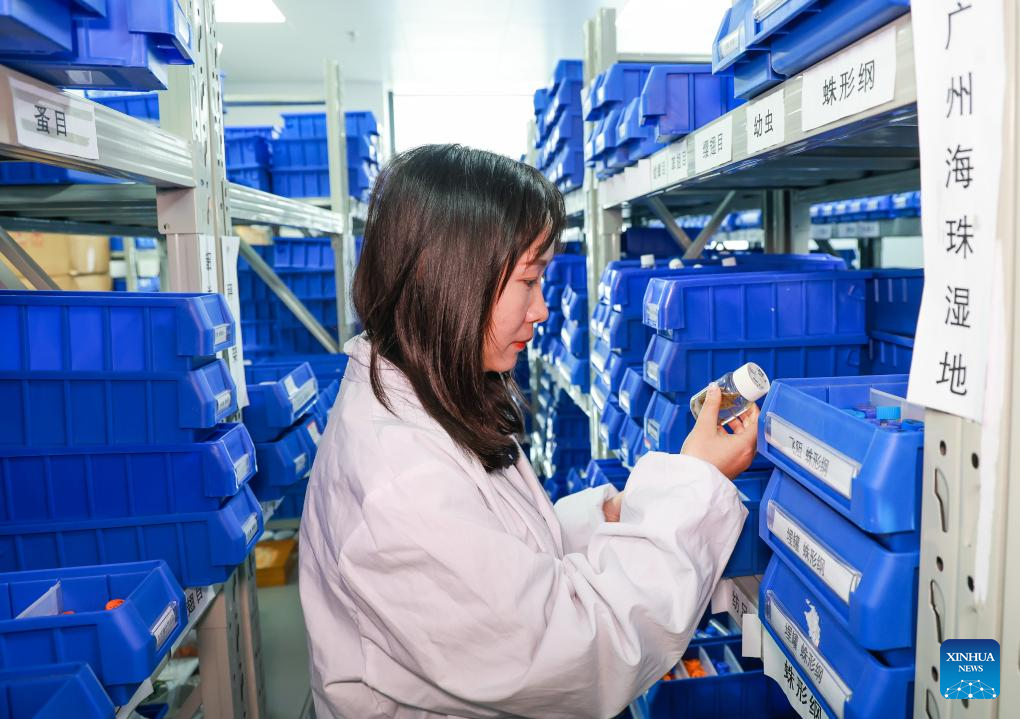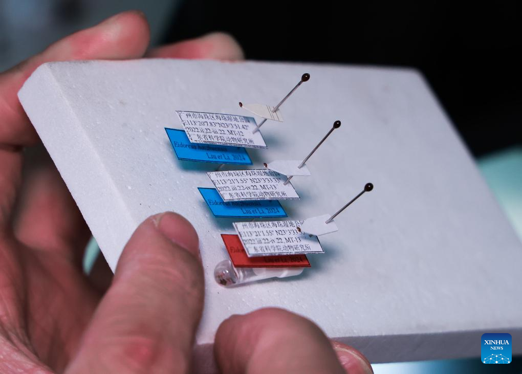 A researcher from the Guangdong Academy of Sciences' Institute of Zoology shows the samples of Eidoreus haizhuensis in Guangzhou, south China's Guangdong Province, Feb. 13, 2025. Chinese researchers have discovered a new insect species, Eidoreus haizhuensis, in a wetland in Guangzhou, the capital city of south China's Guangdong Province, the Guangdong Academy of Sciences said on Sunday. (Xinhua)