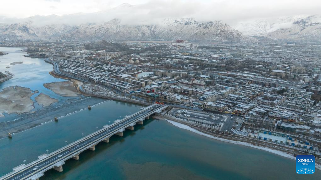 An aerial drone photo taken on Feb. 16, 2025 shows the snow scenery in Lhasa, southwest China's Xizang Autonomous Region. (Xinhua/Jigme Dorje)