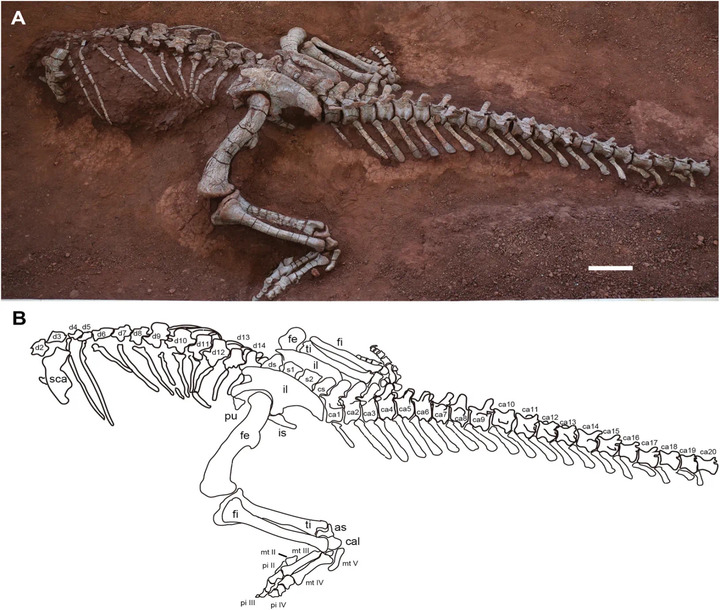 The dinosaur's fossil specimen was initially discovered in 2015 in Lufeng City. It is a well-preserved skeleton located posterior to the head, extending from the second dorsal vertebra to the twentieth caudal vertebra, along with the left scapula and nearly complete girdle and hind limbs.