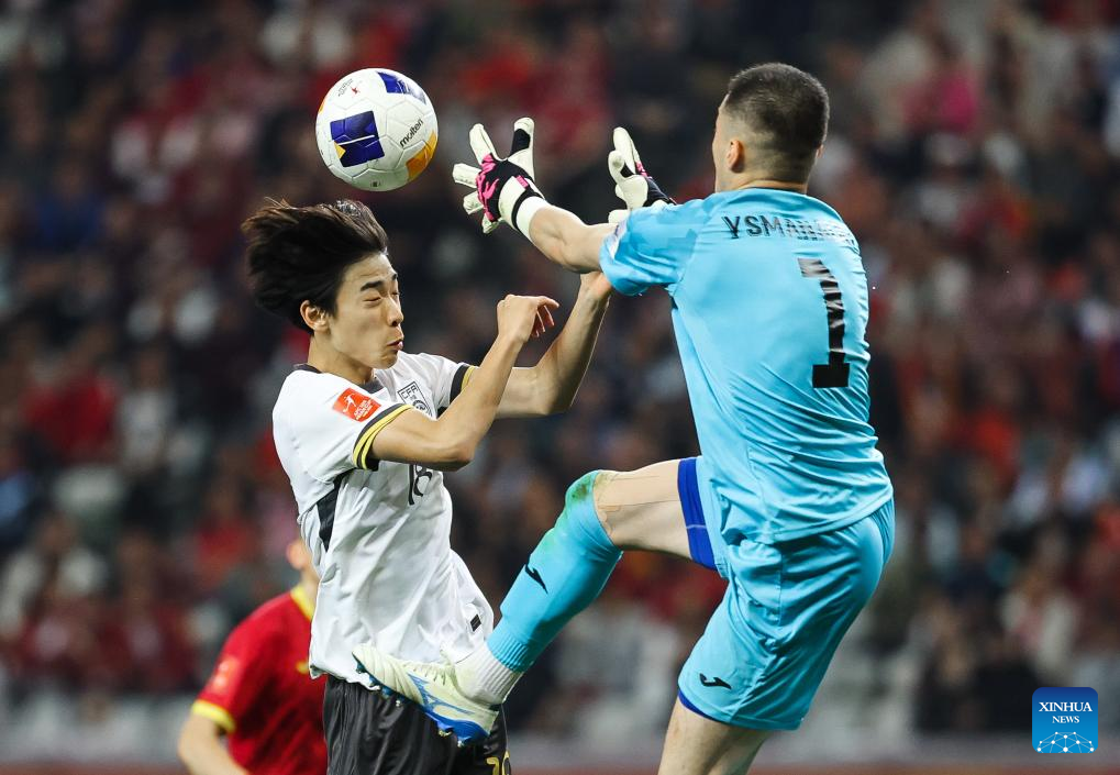 Aziret Ysmanaliev (top L), goalkeeper of Kyrgyzstan competes against Zhu Pengyu (top R) of China during the Group A match between China and Kyrgyzstan at the AFC U20 Asian Cup football tournament in Shenzhen, south China's Guangdong Province, Feb. 15, 2025. (Xinhua/Liang Xu)