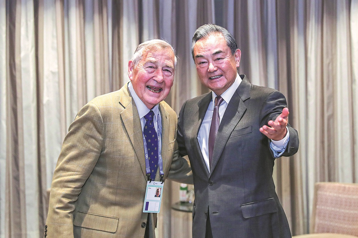 Foreign Minister Wang Yi meets with Graham Allison, a professor of international politics at Harvard University, on Friday on the sidelines of the Munich Security Conference in Germany. ZHANG FAN/XINHUA