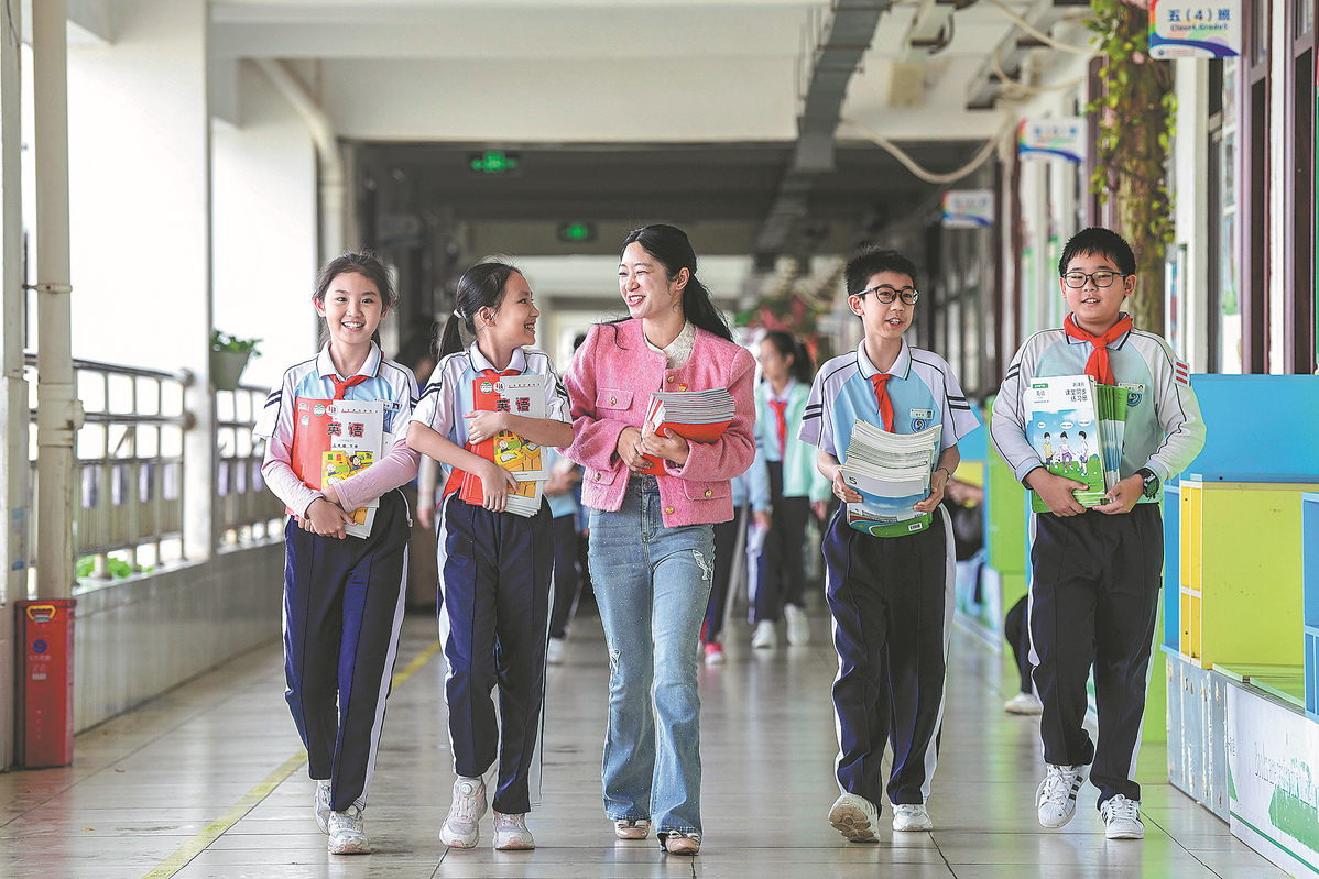 Students and their teacher carry textbooks in a primary school in Haikou, Hainan province, on Sunday, as they prepare for the new semester that begins on Monday. [Photo by Su Bikun/For China Daily]