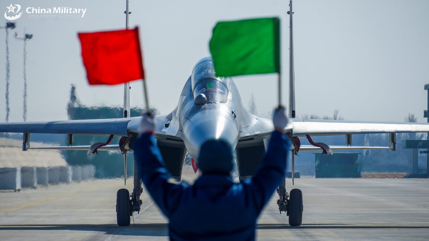 A maintenance member assigned to an aviation brigade under the Chinese PLA Air Force guides a J-16 multi-role fighter jet back to the hangar after a flight training exercise on January 16, 2025. (eng.chinamil.com.cn/Photo by Zhu Yunlong)