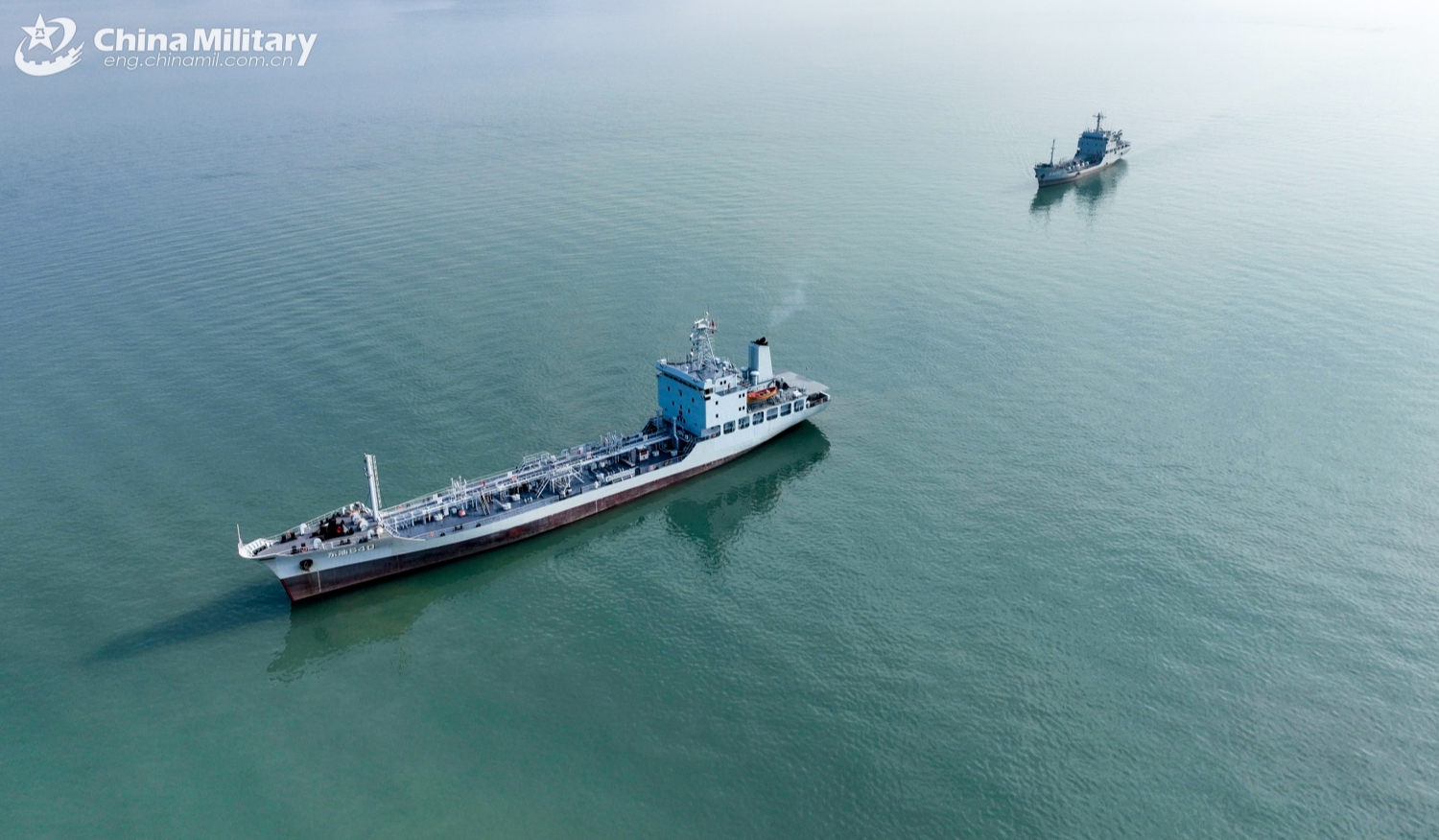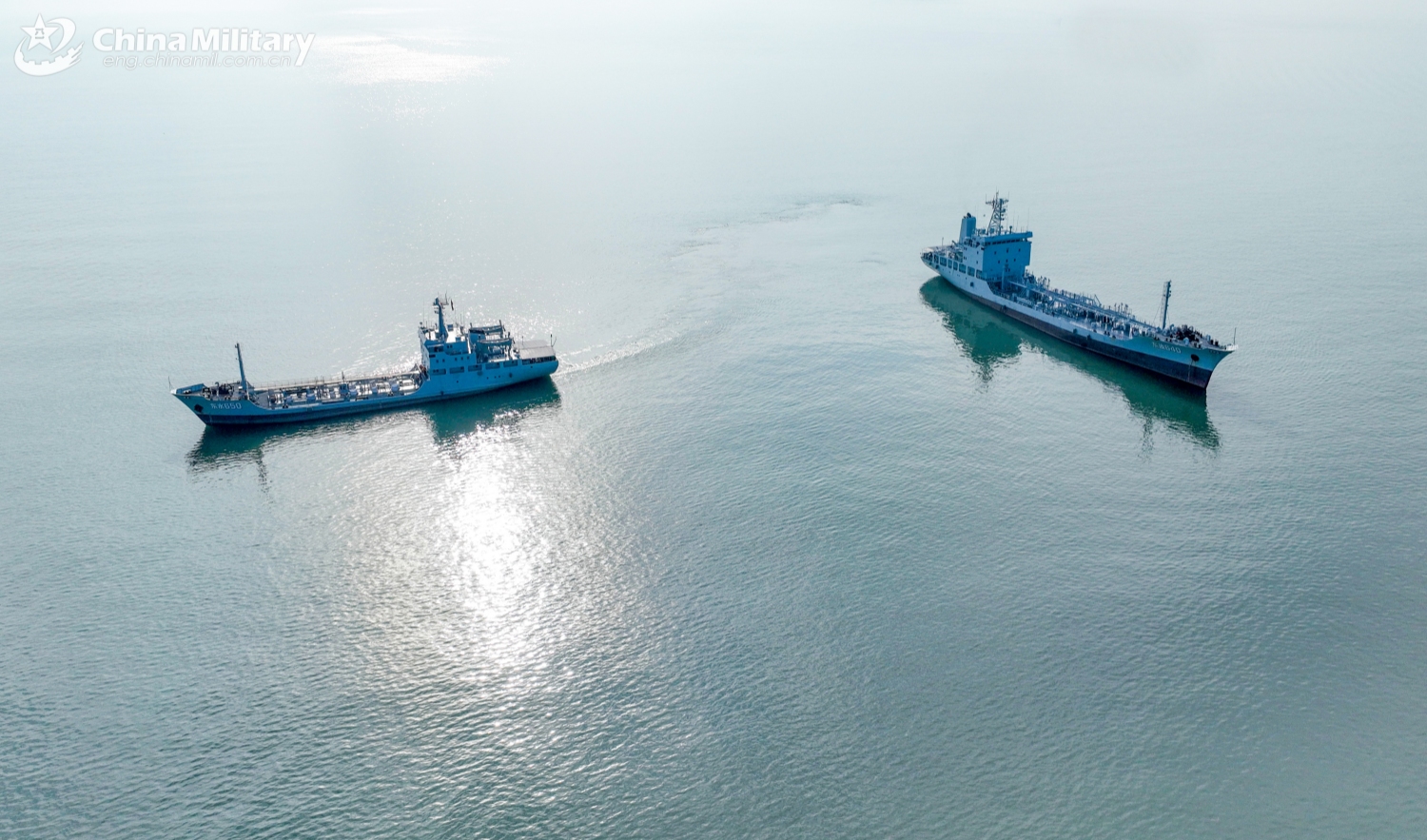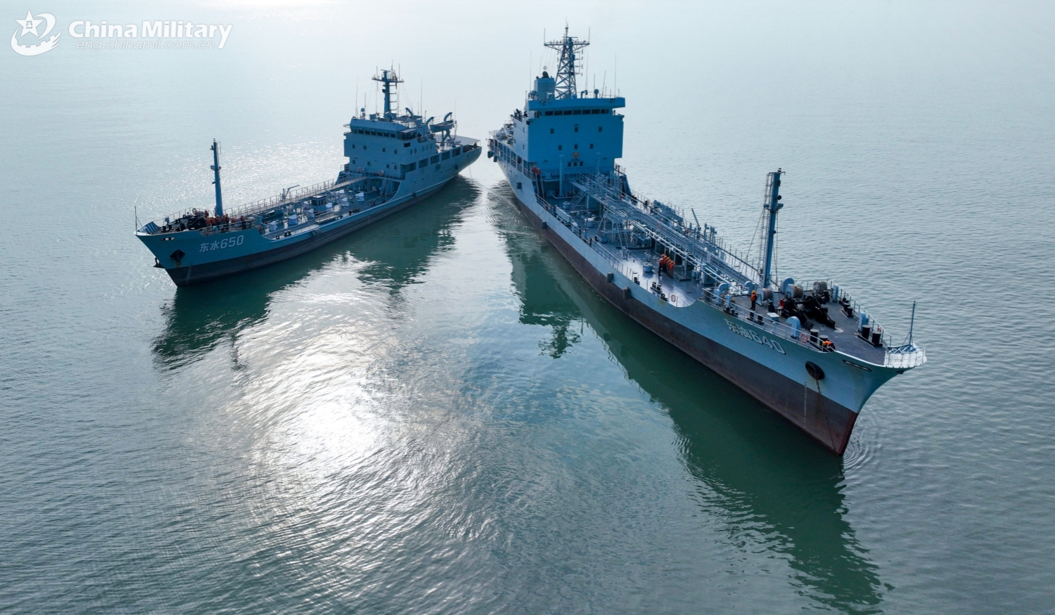 A water tanker ship and an oil tanker ship attached to a service ship group with the navy under the Chinese PLA Eastern Theater Command maneuver at sea during a maritime training exercise in early January, 2025. (eng.chinamil.com.cn/Photo by Chu Chengtao)
