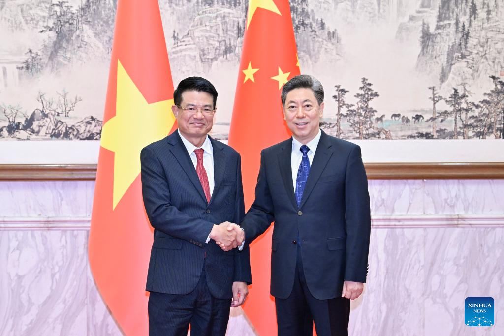 BEIJING, Feb. 17 (Xinhua) -- Chen Wenqing, a senior official of the Communist Party of China (CPC), met with Nguyen Huy Tien, prosecutor general of the Supreme People's Procuracy of Vietnam, in Beijing on Monday.