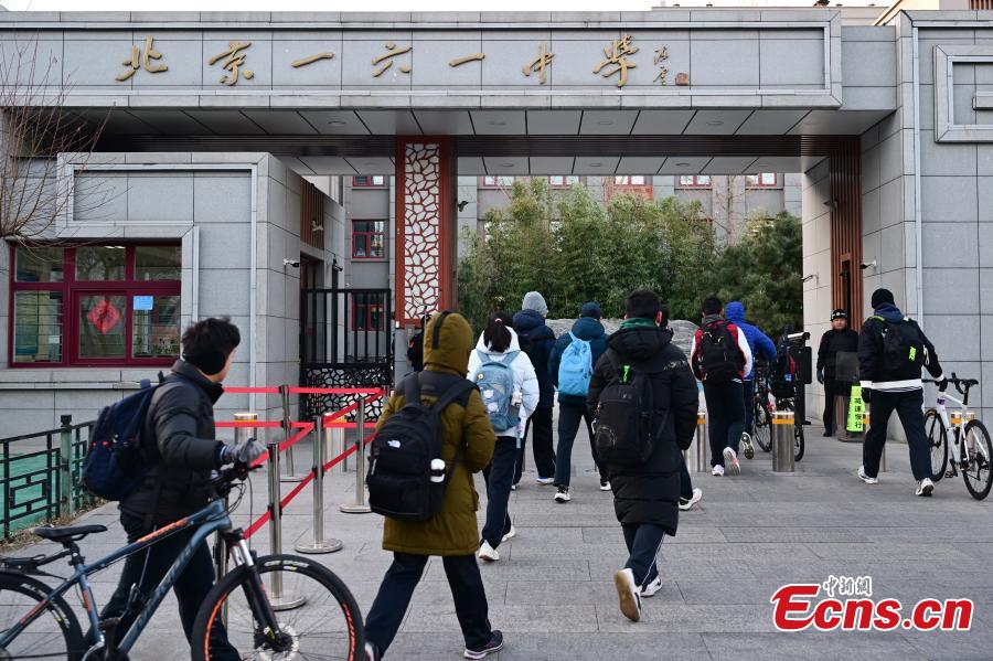 Students walk into the school campus of No. 161 Middle School in Beijing, Feb. 17, 2025. (China News Service/Tian Yuhao)