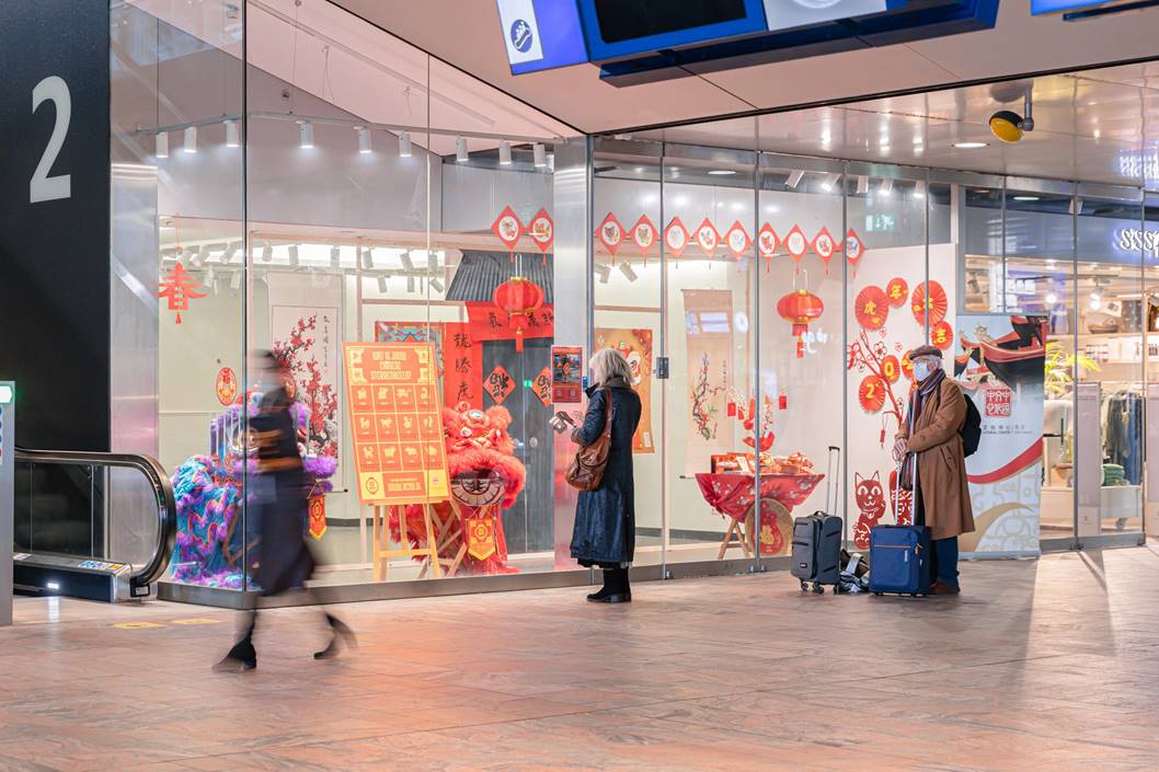 Photo shows a pop-up window display with the theme of "Happy Spring Festival", featuring the design by Hu Fenmei, at Rotterdam Central Station in Rotterdam, the Netherlands. (Photo/China Cultural Center Den Haag)