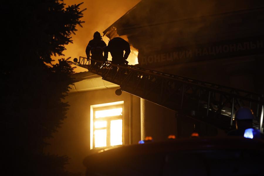 Firemen try to put out fire at a building in Donetsk, Aug. 5, 2023. (Photo by Victor/Xinhua)