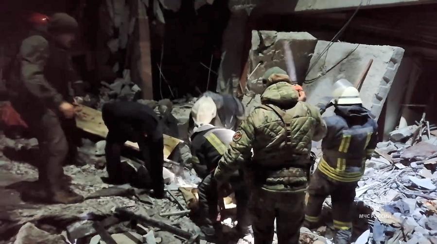 A video screenshot released by Russia's Ministry of Emergency Situations shows rescuers working at the site of shelling in the city of Lysychansk in the Lugansk region, Feb. 3, 2024. (Xinhua)