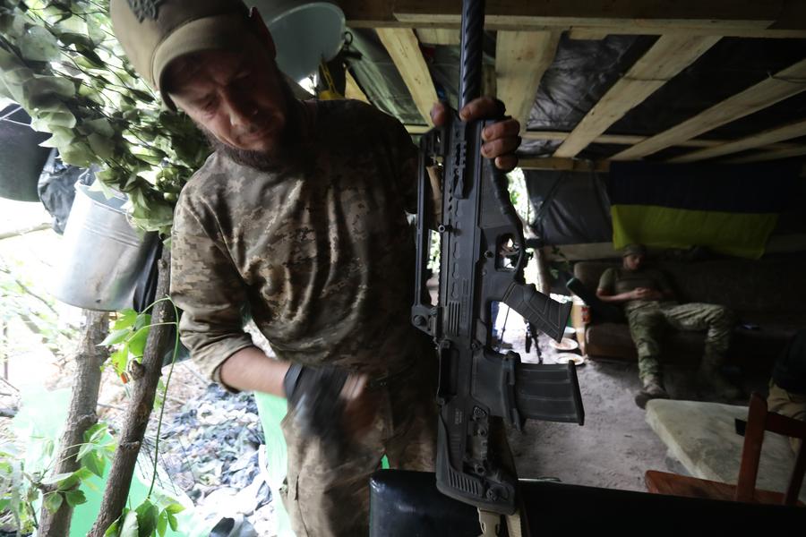 A soldier of the motorized rifle battalion of the 93rd brigade shows an anti-drone shotgun at a position in Donetsk on Aug. 15, 2024. (Photo by Peter Druk/Xinhua)