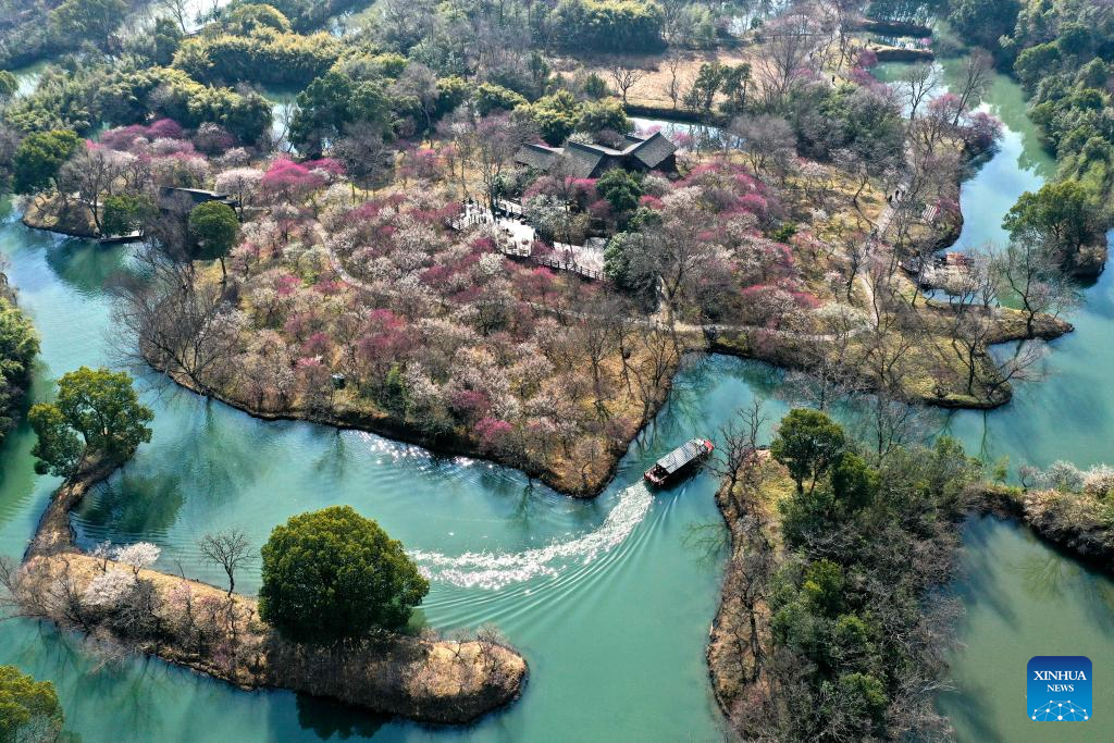 An aerial drone photo taken on Feb. 18, 2025 shows a sightseeing boat at the Xixi National Wetland Park in Hangzhou, east China's Zhejiang Province. The Xixi wetland in Hangzhou has entered the best season for viewing plum blossoms. (Xinhua/Huang Zongzhi)