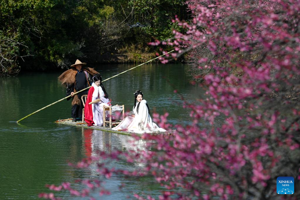 People in traditional costumes enjoy plum blossoms while riding a bamboo raft at the Xixi National Wetland Park in Hangzhou, east China's Zhejiang Province, Feb. 18, 2025. The Xixi wetland in Hangzhou has entered the best season for viewing plum blossoms. (Xinhua/Huang Zongzhi)