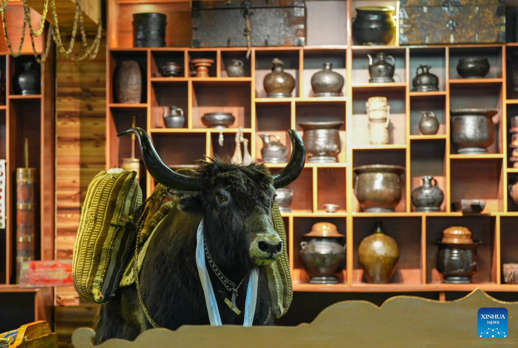 This photo taken on Feb. 13, 2025 shows an animal specimen at a Tibetan-style teahouse in Seni District of Nagqu, southwest China's Xizang Autonomous Region. Covering an area of around 1,200 square meters, the Tibetan-style teahouse presents customers with both Tibetan delicacies and immersive experiences of folklore culture. Themed over 3,000 pieces of traditional Tibetan folk artifacts, the teahouse offers a lens through which people can learn about the northern Xizang nomadic culture. (Xinhua/Jigme Dorje)