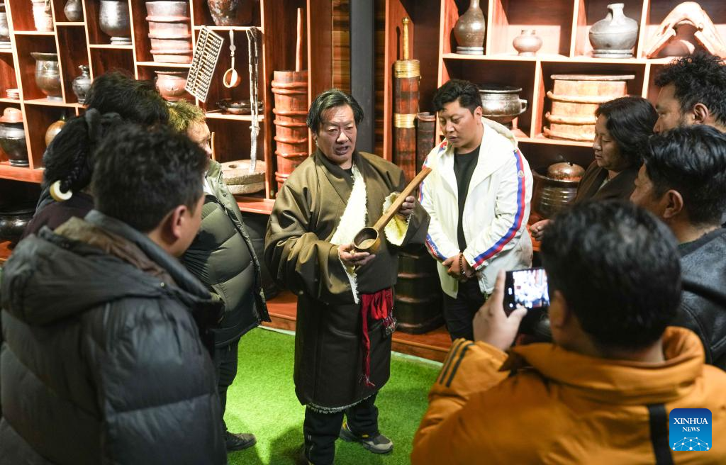 A local folklore specialist (C) introduces a folk artifact at a Tibetan-style teahouse in Seni District of Nagqu, southwest China's Xizang Autonomous Region, Feb. 13, 2025. Covering an area of around 1,200 square meters, the Tibetan-style teahouse presents customers with both Tibetan delicacies and immersive experiences of folklore culture. Themed over 3,000 pieces of traditional Tibetan folk artifacts, the teahouse offers a lens through which people can learn about the northern Xizang nomadic culture. (Xinhua/Jigme Dorje)