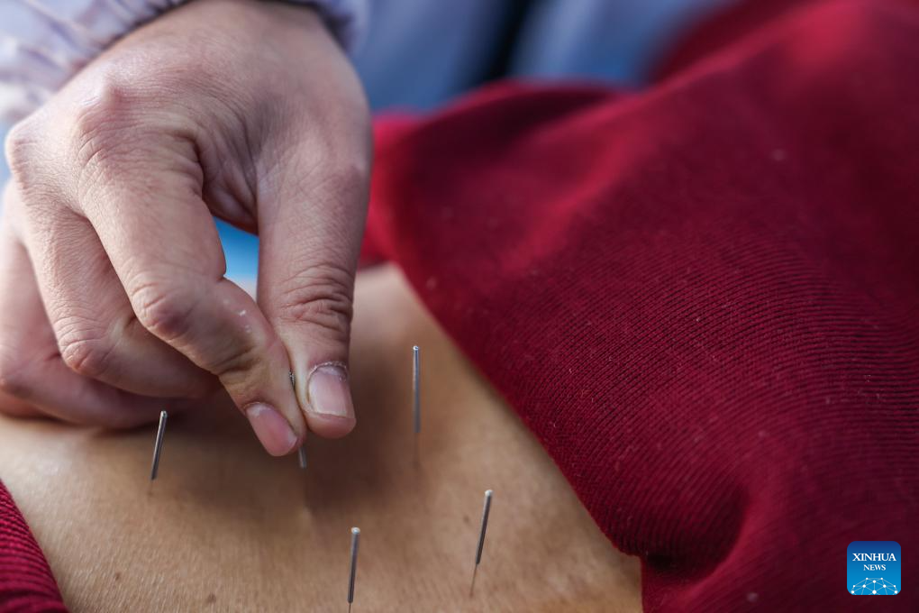 A traditional Chinese medicine (TCM) practitioner provides Tuina treatment, a form of TCM therapeutic massage, to a patient at a clinic in Zhaojia Township, Zhuji, east China's Zhejiang Province, Feb. 18, 2025.