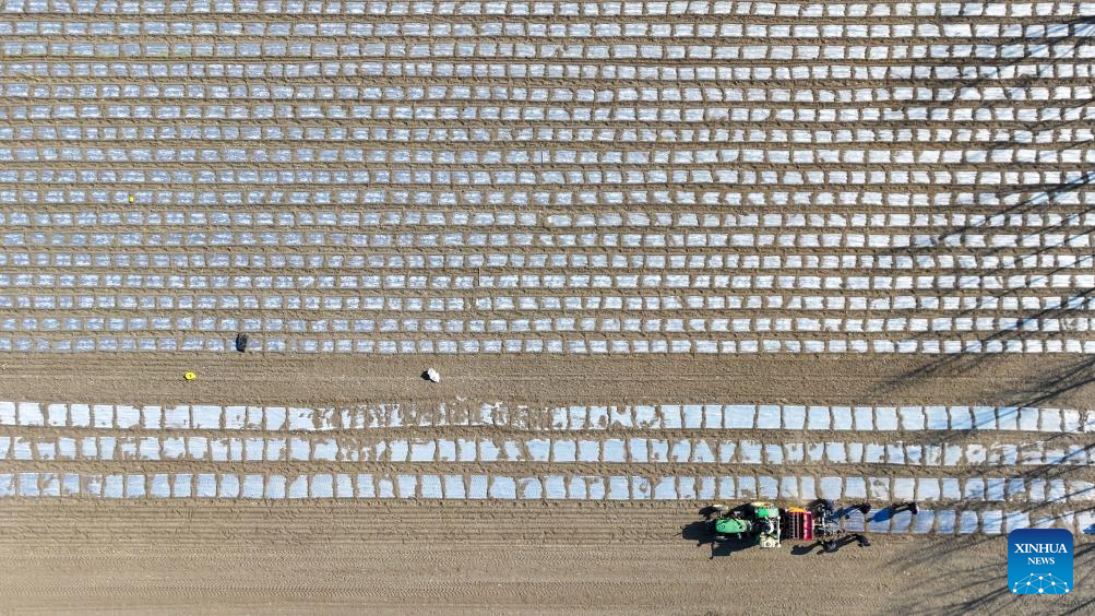 An aerial drone photo taken on Feb. 18, 2025 shows a seeder equipped with the BeiDou Navigation Satellite System sowing in a field during the day of Yushui (Rain Water), the second of the 24 solar terms in the Chinese lunar calendar, in Lintingkou Town, Baodi District, north China's Tianjin Municipality. (Xinhua/Sun Fanyue)